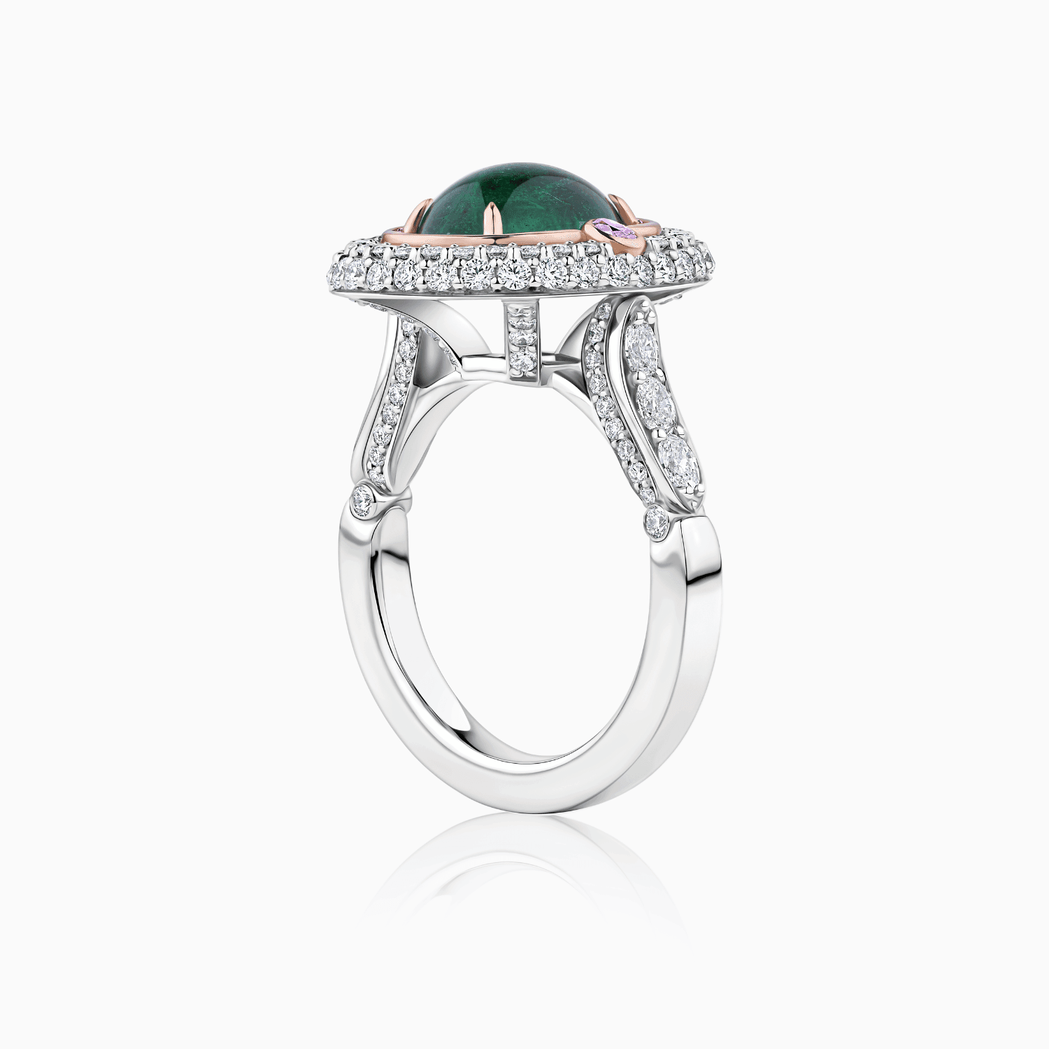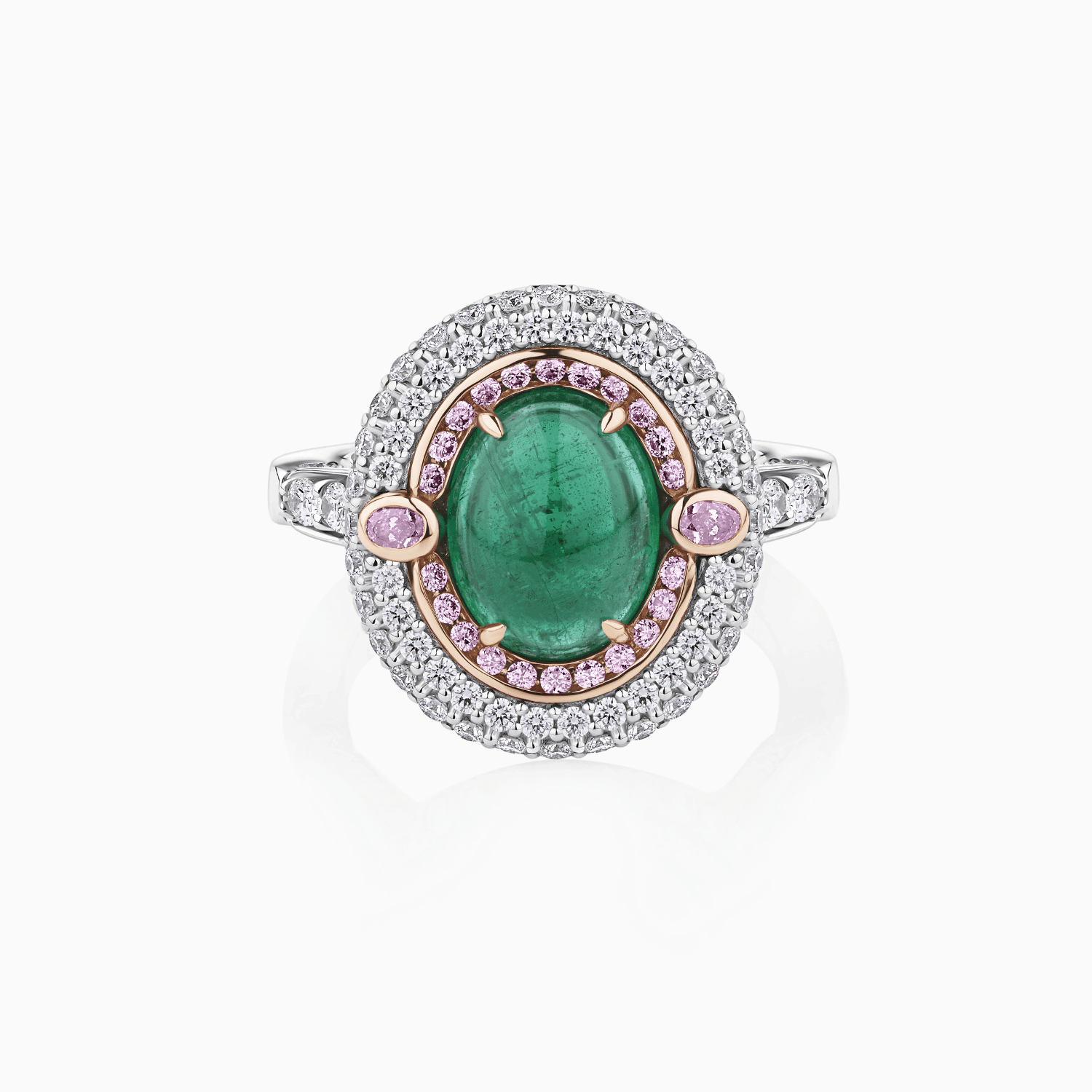The Isla design centres around a striking 2.53 carat oval cabochon emerald, cradled in a refined four-claw setting. Its smooth, luminous surface is framed by an 18ct rose gold channel of Argyle 6PP round brilliant pink diamonds—an exquisite halo of warmth and rarity. On either side, a pair of rare Argyle 5PP oval diamonds are bezel-set in soft rub-over settings, balancing colour with perfect symmetry.