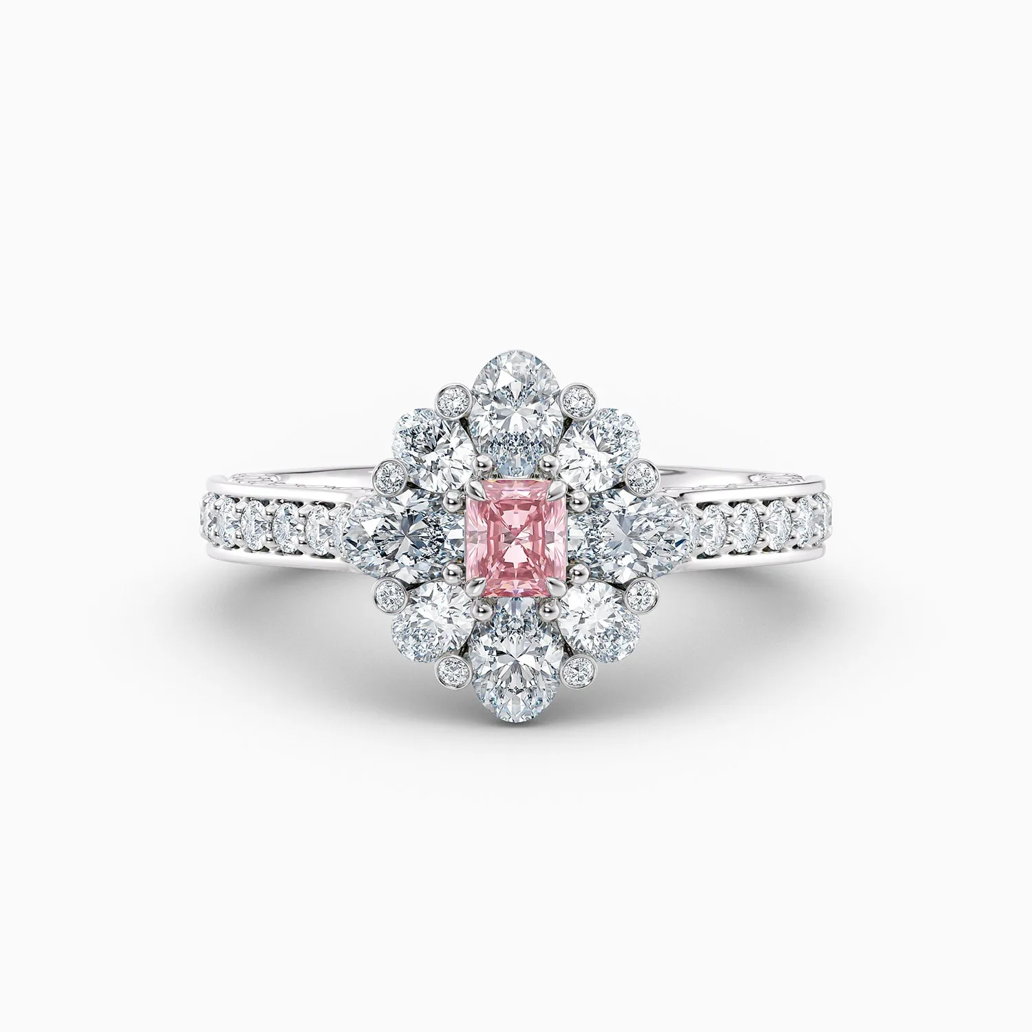 Surrounding the central pink diamond is a graceful halo of D colour oval and round brilliant white diamonds. These high-quality stones continue along the band’s edges, creating a dazzling frame that enhances the soft, vibrant pink tones at the centre. The combination of shapes and sparkle delivers a timeless yet modern aesthetic.
