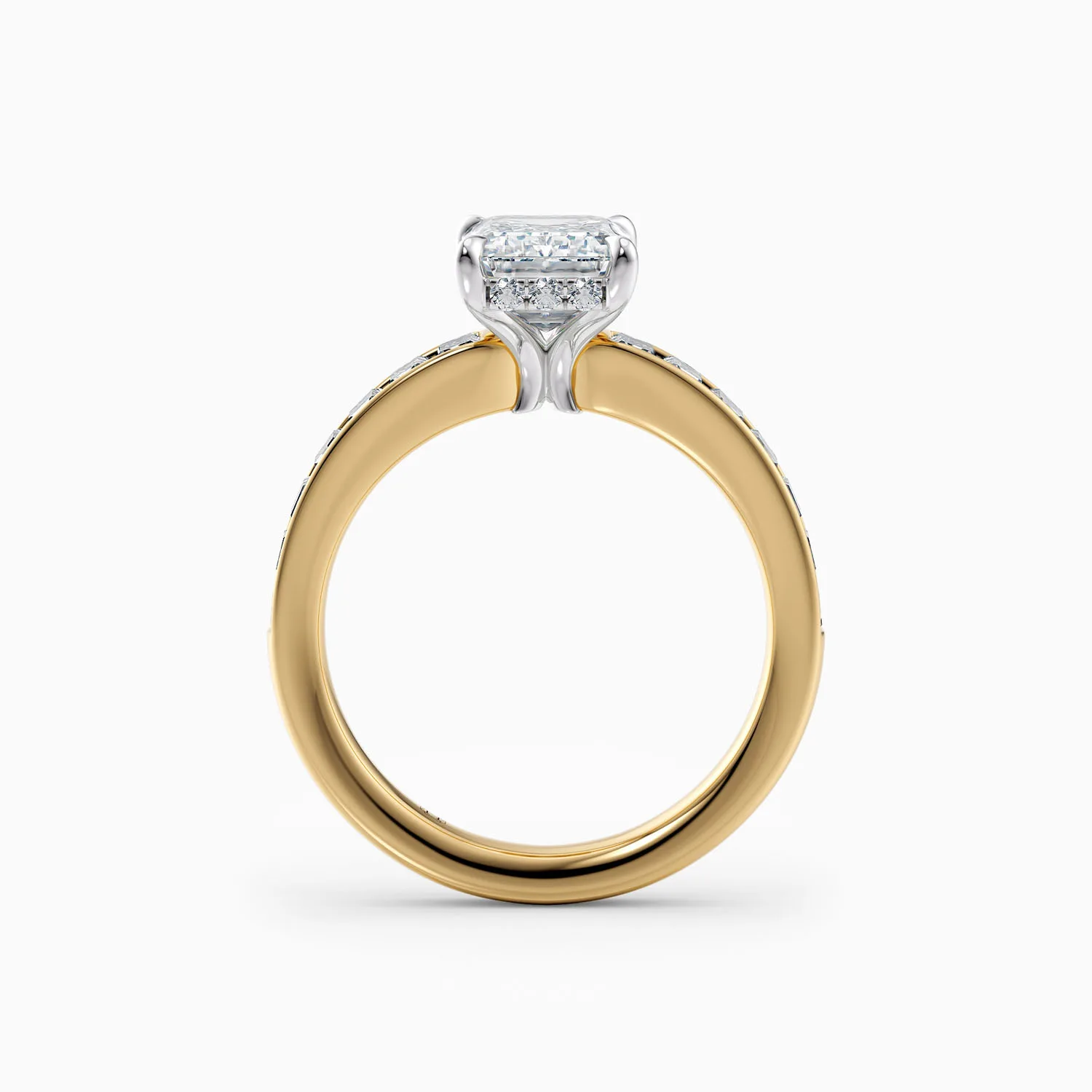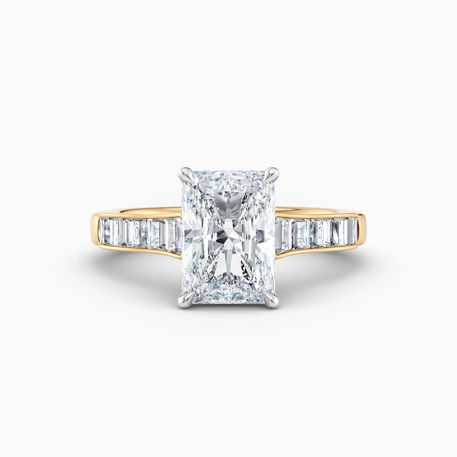 Available in 1ct, 2ct, and 3ct options, the radiant cut’s unique shape enhances finger length while maximising brilliance. Framing the centre stone, channel-set trapezoid and baguette diamonds add a refined geometric balance, enhancing its elegant sparkle.