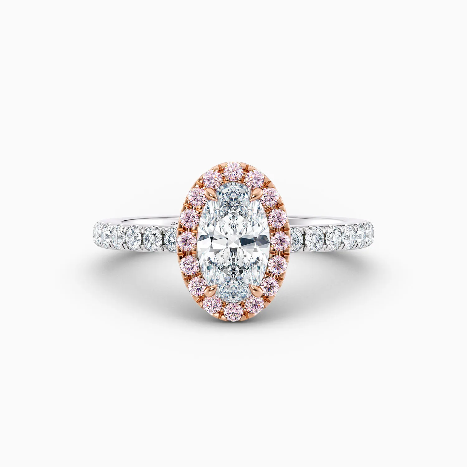 The Nora design is a refined and elegant halo engagement ring, combining simplicity with luxurious detail. At its centre is a 1.00ct Oval Brilliant Cut diamond, GIA certified for its exceptional quality and sparkle. Surrounding the centre stone is a delicate halo of rare Argyle 6PP pink diamonds, set in 18ct rose gold, offering a soft contrast and a romantic touch of colour.