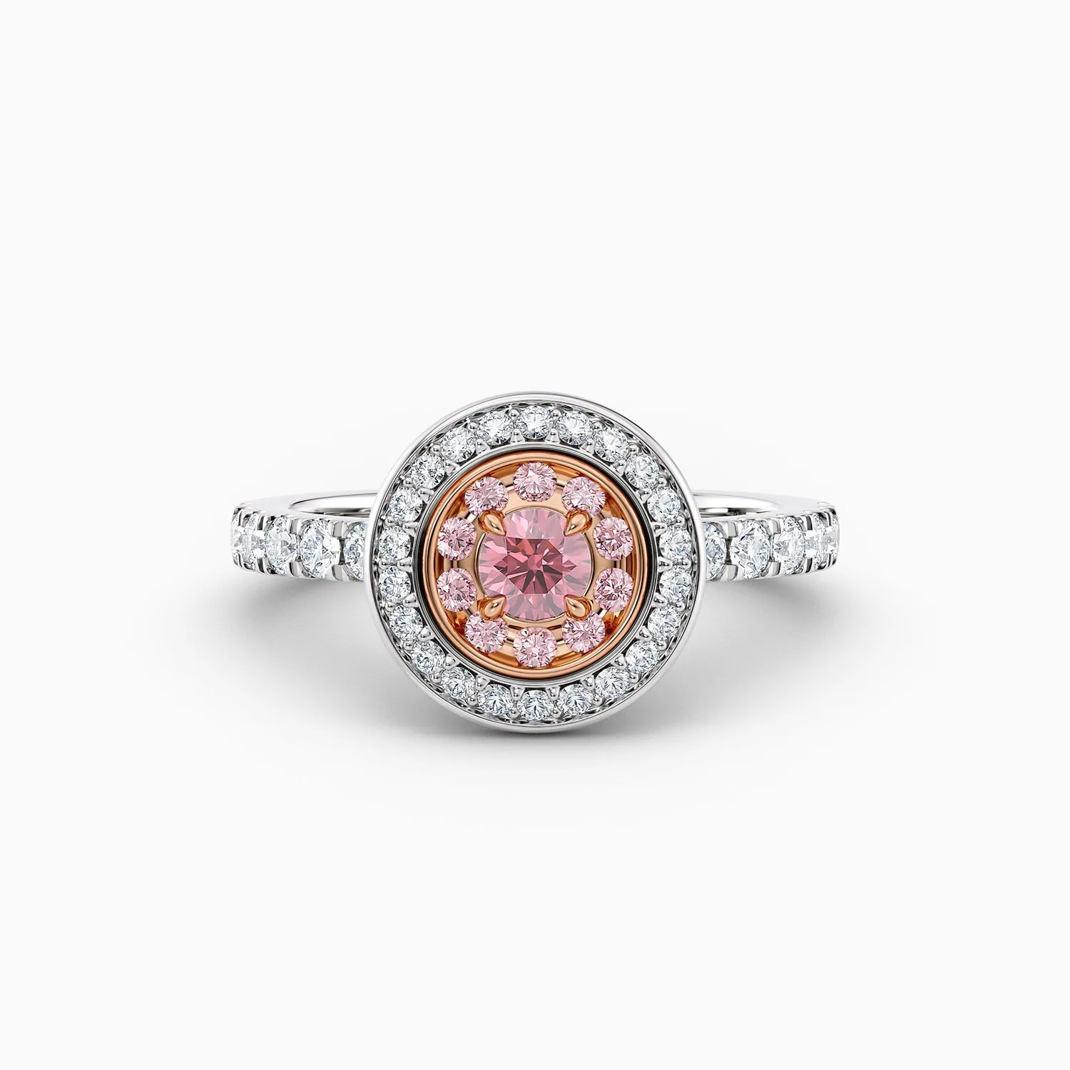 Encircling the centre diamond is a channel-set halo of matching Argyle 6P pink diamonds, set in warm rose gold to enhance their natural colour and glow. This pink halo creates a soft contrast that draws the eye inward while highlighting the rarity of the Argyle stones. The outer halo and elegant band are adorned with E colour round brilliant diamonds, providing a clean, bright finish that enhances the overall brilliance of the ring.