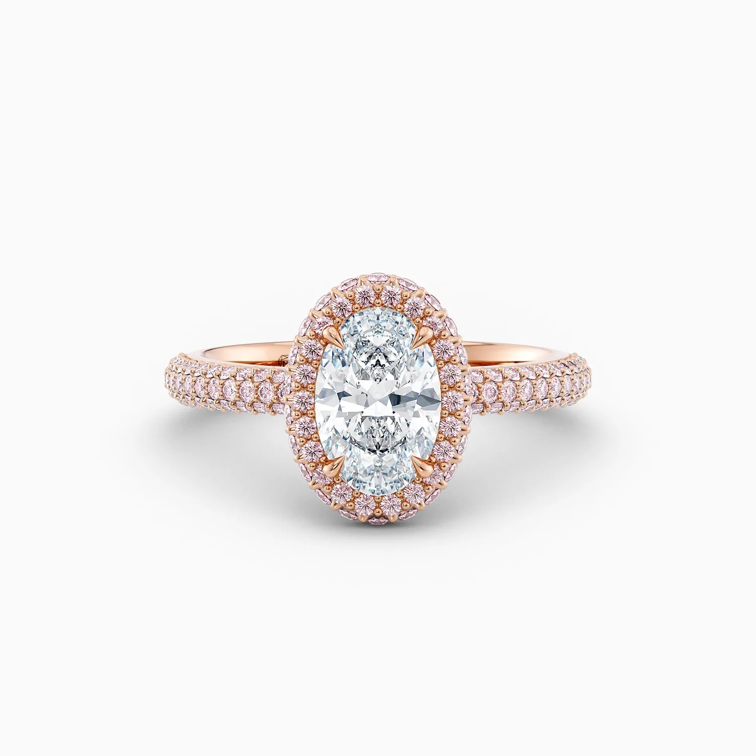 Surrounding the centre diamond is a double roll halo of pavé-set Argyle 6PP pink diamonds, delicately set in 18ct rose gold. The rare pink diamonds create a soft, warm contrast that enhances the brilliance and shape of the oval centre stone.