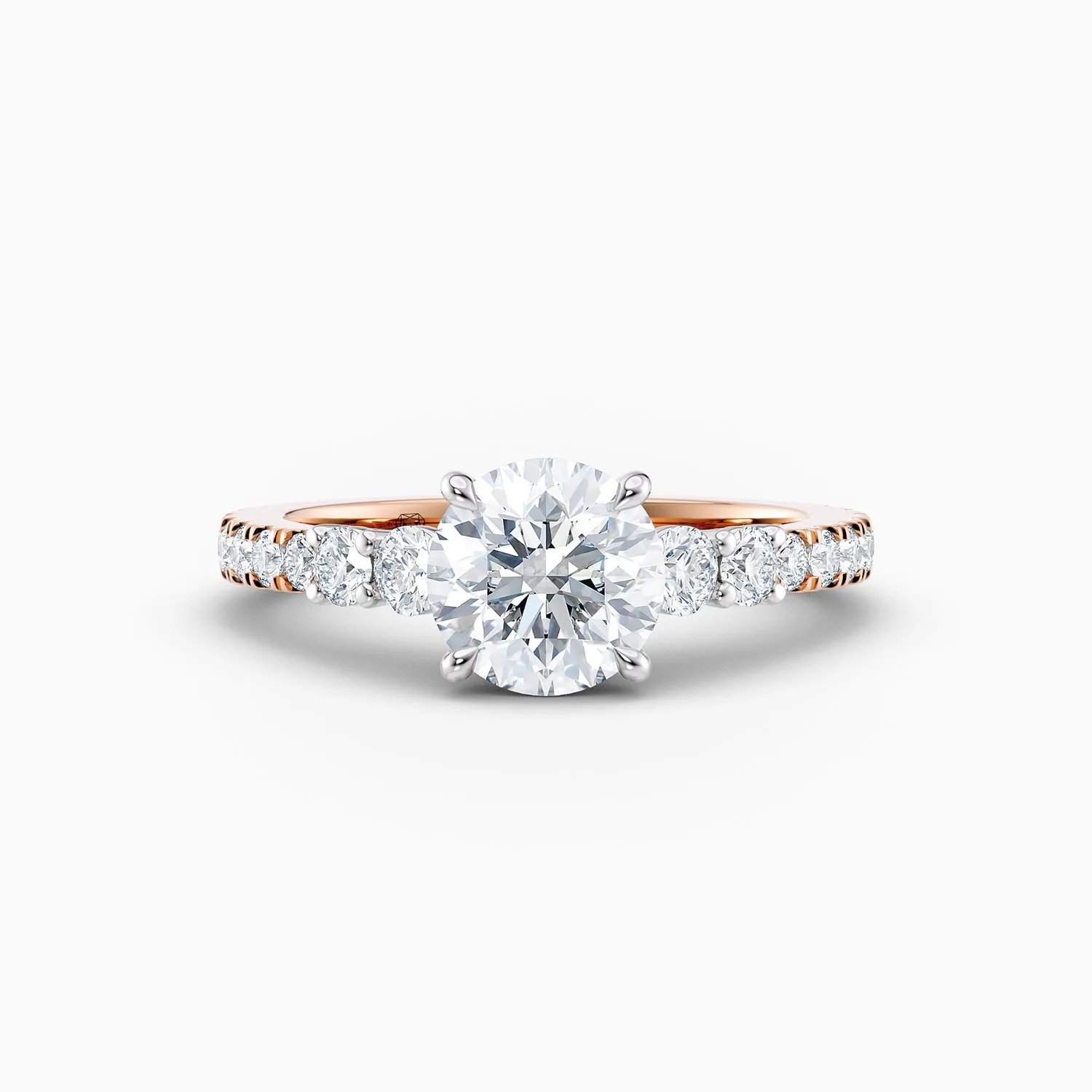 The Lucretia engagement ring is a striking five-diamond design, crafted to showcase brilliance and symmetry. At its centre is a 1.5ct round brilliant cut diamond, GIA-certified triple excellent, with F colour and SI2 clarity—chosen for its exceptional fire and presence. Four matching round brilliant diamonds are set on either side, creating a seamless line of sparkle. Hidden beneath the centre stone is a delicate halo of white diamonds, adding an elegant detail only visible from certain angles.