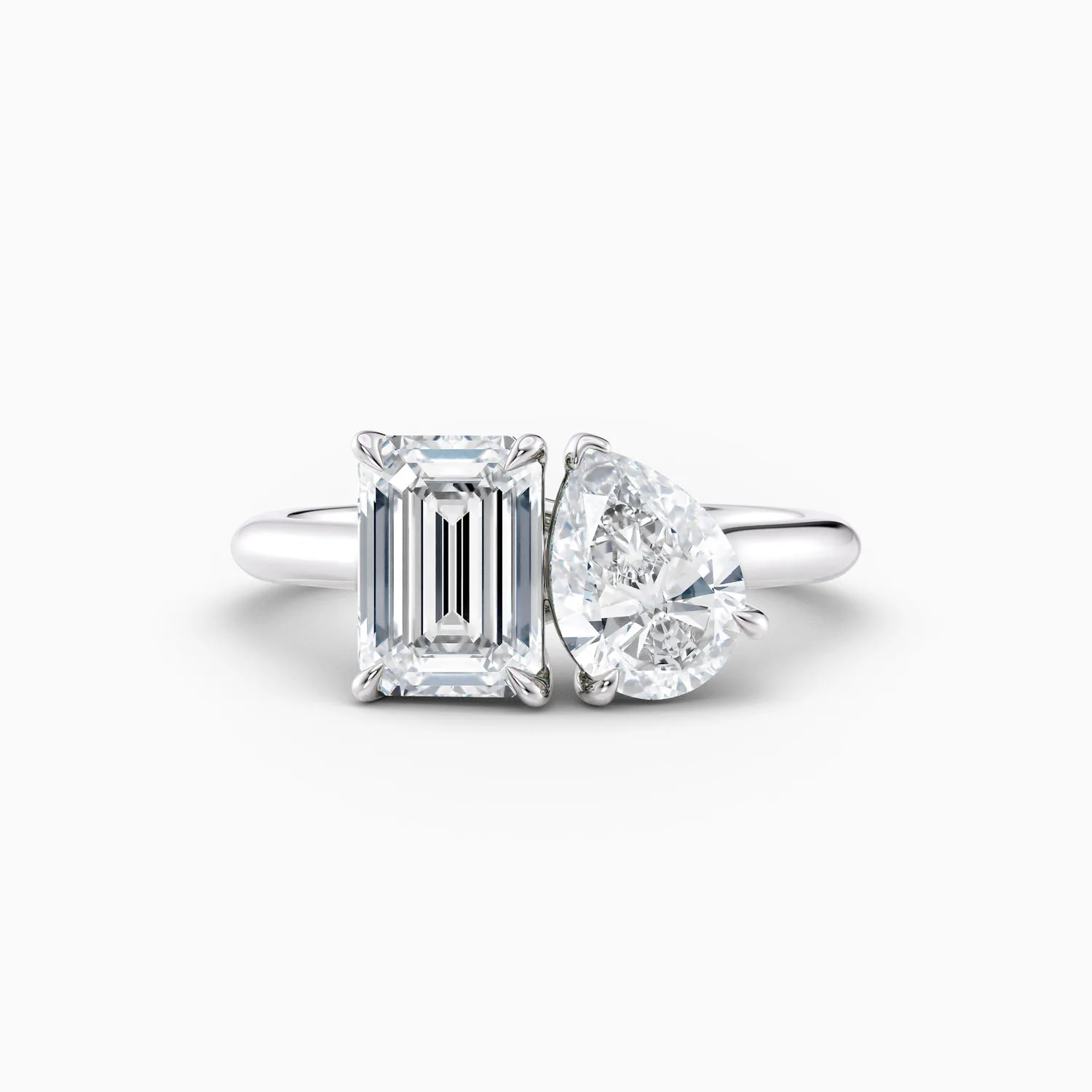 The Juliette design is a romantic and elegant interpretation of the classic Toi et Moi ring, a French phrase meaning “you and me” Symbolising two souls joined together, this timeless style carries a beautiful sentiment behind its distinctive form. The Juliette features a 1.50ct GIA-certified Emerald Cut diamond paired with a 1.20ct Ideal Cut Pear Shaped diamond—two unique shapes that perfectly complement one another.