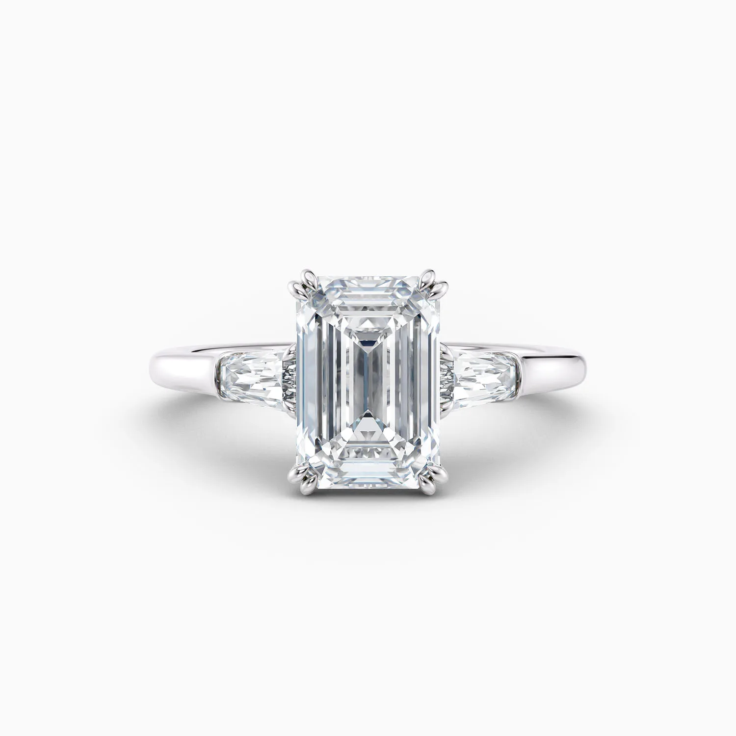 The Clara design is a beautiful modern take on a timeless classic. With clean lines and balanced proportions, this three-stone engagement ring features your choice of a 1ct, 1.5ct, or 2ct Emerald Cut GIA-certified centre diamond. Known for its elegant geometry and hall-of-mirrors effect, the emerald cut is flanked by two matching tapered baguette diamonds, all set in refined white gold claws that highlight their crisp, architectural shapes.