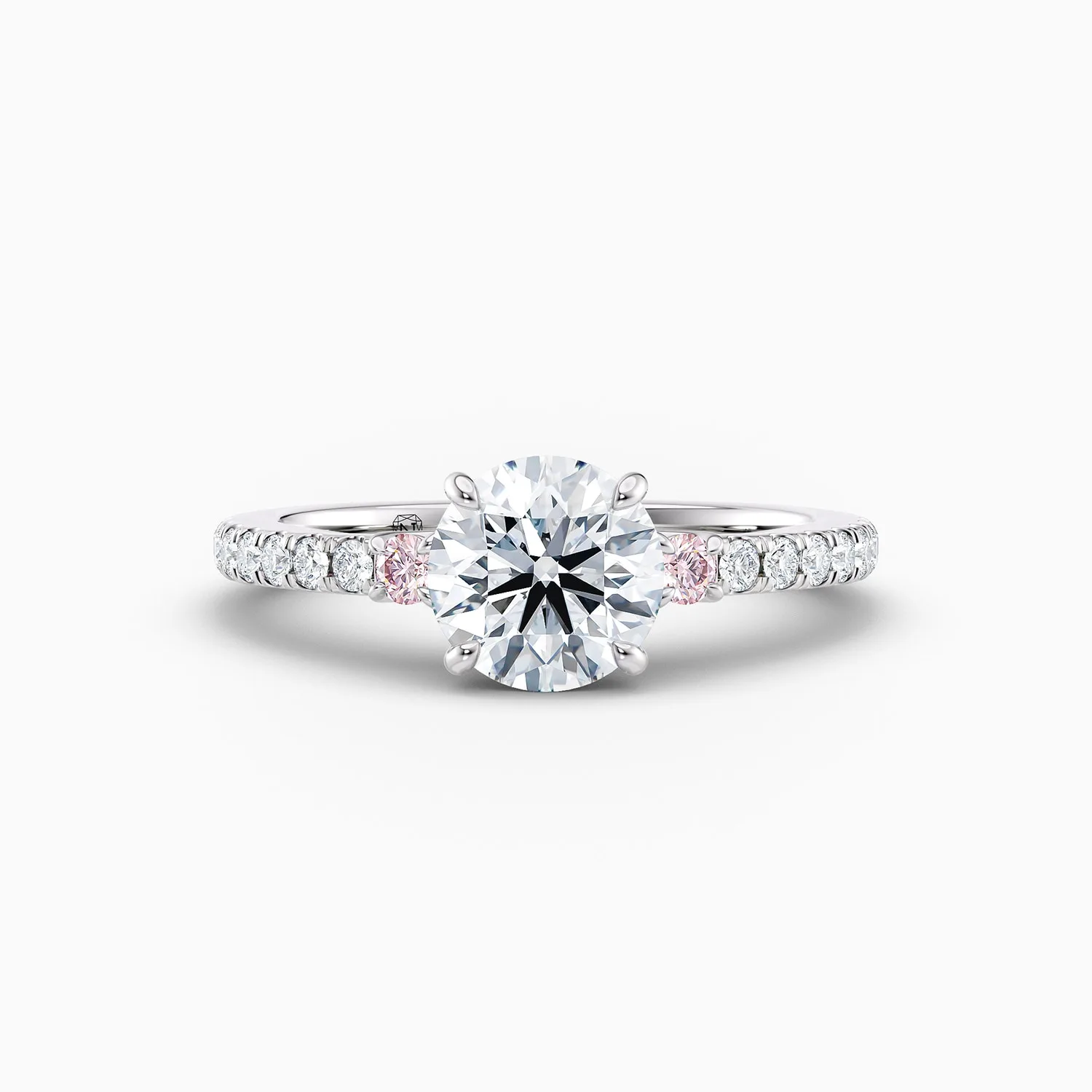 The Claudia design is a stunning showcase of contrast, craftsmanship, and timeless beauty. At its centre lies a 1.50ct D SI2 Triple Excellent diamond, prized for its exceptional cut, polish, and symmetry. It’s flanked by two rare 0.08ct Argyle 6PP pink diamonds, adding a soft pop of colour and elegance. All three stones are set in a refined platinum setting that highlights their brilliance.