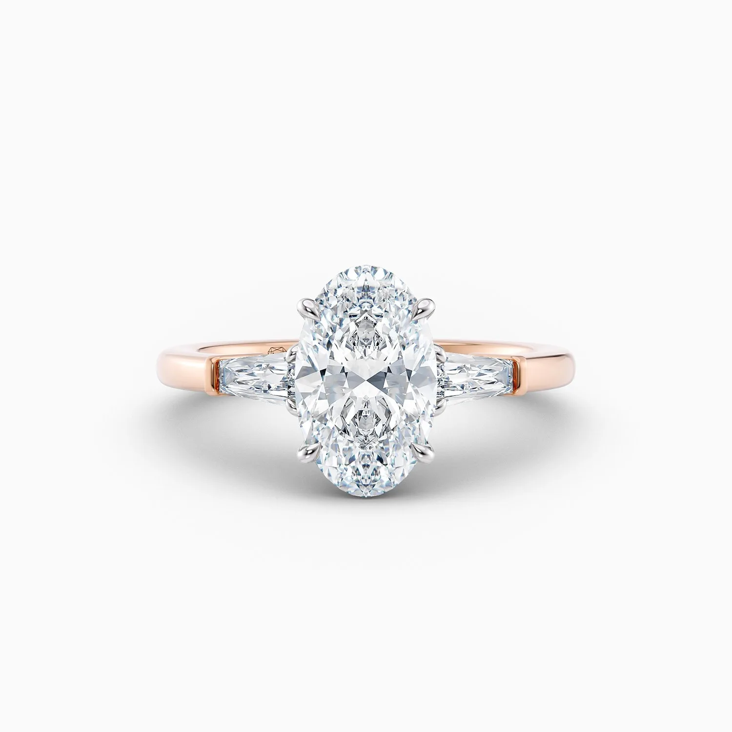 Flanking the centre diamond are two tapered baguette diamonds, totalling 0.52ct. End set in white gold to showcase their clean lines and step-cut beauty, these side stones add a refined, architectural element to the design while directing focus to the central oval diamond. The setting contrasts beautifully with the warm 18ct yellow gold band.