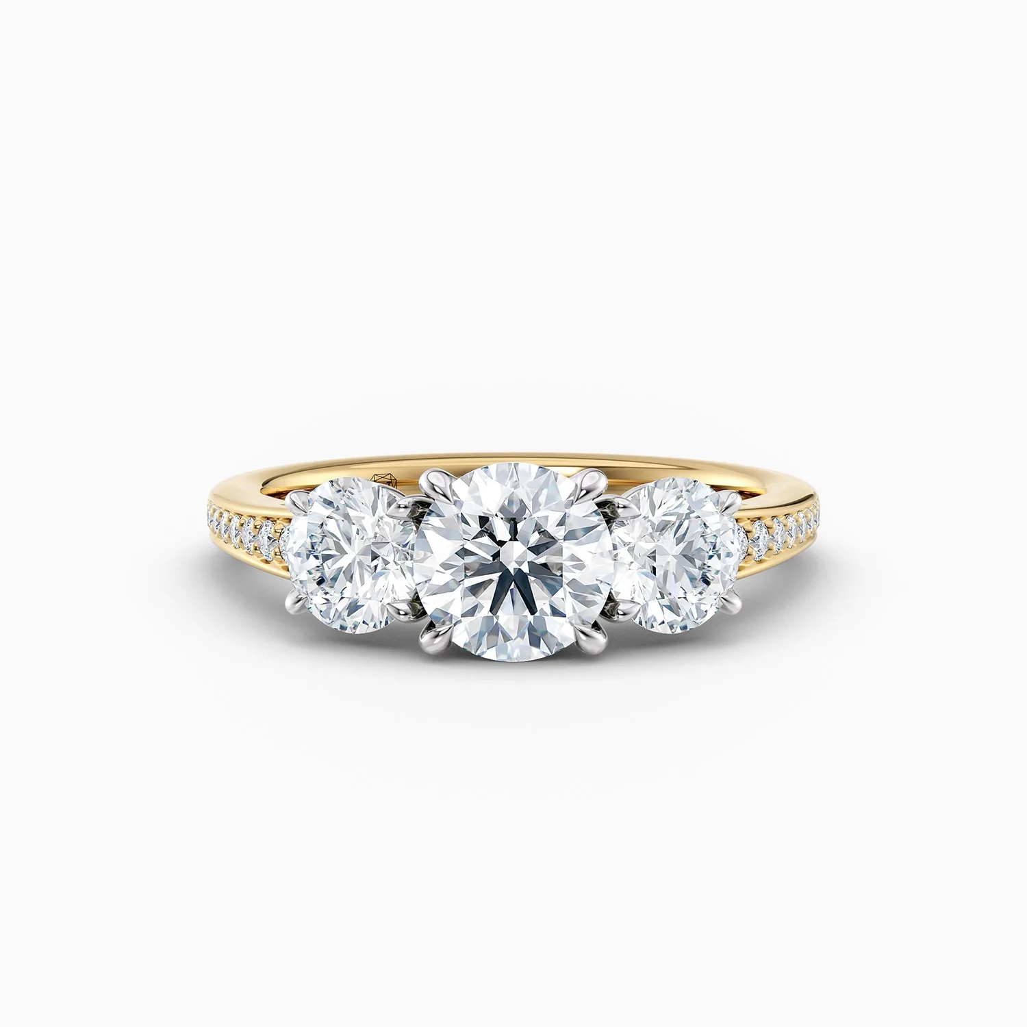 The Theodora design is a beautifully balanced three-stone engagement ring, showcasing a 1ct GIA-certified Triple Excellent centre diamond. Flanked by two 0.50ct matching Triple Excellent diamonds on either side, the combination creates a harmonious and elegant composition. All three stones are claw set in platinum, allowing for maximum brilliance and light return, while hidden diamonds along the sides of the setting offer a delicate sparkle from unexpected angles.