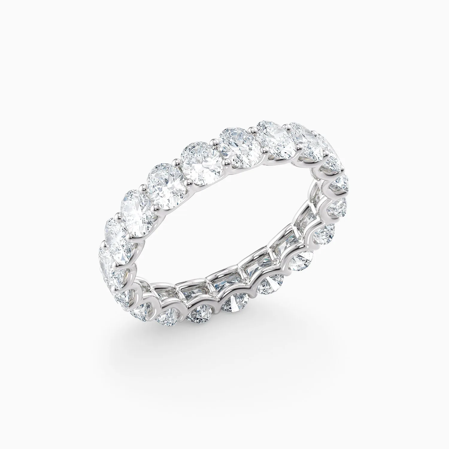 Shown here in platinum, the Letita ring offers a sleek and refined contrast that enhances the fire and clarity of each diamond. The oval cuts provide a soft, elongated shape that flatters the hand and catches the light from every angle, giving the ring a graceful yet impactful presence.